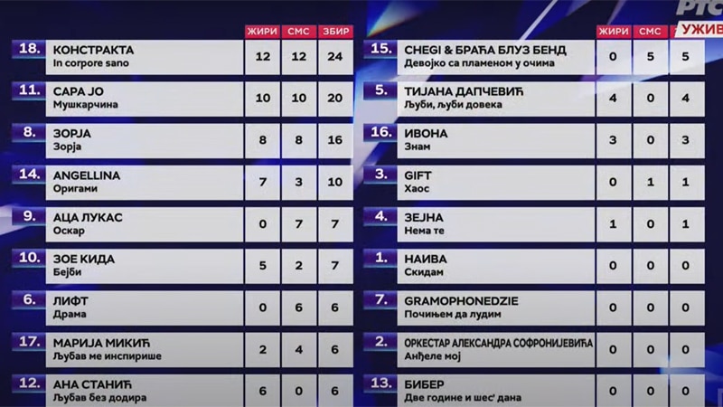 Konstrakta je večeras u finalu „Pesme za Evroviziju 22“ izabrana sa maksimalnim brojem glasova i žirija i publike. Na drugom mestu se našla pesma Muškarčina u izvođenju Sare Jo, a na trećem pesma Zorja koju izvodi istoimena pevačica.