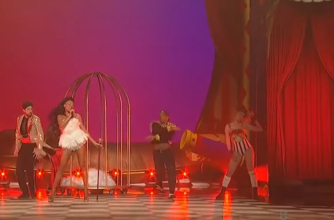 Kat Dosa se pojavila u zlatnom kavezu i belom perjanom mini haljinom, a onda je pred kraj nastupa skinula belu toaletu i zasijala i srebrnoj kreaciji.