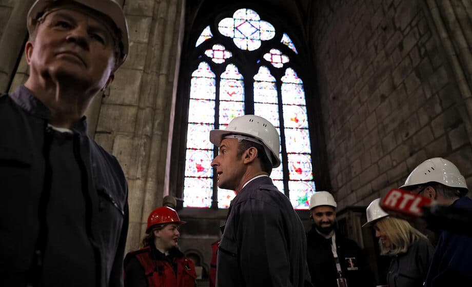 Emanuel Makron katedrali u Notr Dam EPA-EFE/IAN LANGSDON / POOLRadovi na rasklanjanju 2.500 kvadratnih metara vitraža koji je bio prekriven naslagama čađi u slavnoj pariskoj katedrali Notr Dam iz 12. veka koja je nastradala u požaru 2019. godine, ne prestaju.