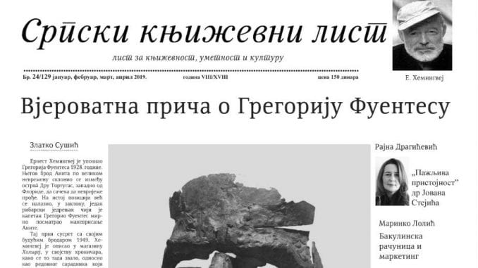 Tu nadu daje najnoviji broj Srpskog književnog lista koji je upravo izašao iz štampe. Iako nekad mesečni, a sada četvoromesečni, SKL je zadržao svoj profil po kojem se prepoznaje, zahvaljujući glavnom i odgovornom uredniku Petru Cvetkoviću, i saradnicima koji ne odustaju da svojim prilozima vrednost ovog časopisa održe na zahtevnoj intelektualnoj visini. Najnoviji broj, 24/129, za januar, februar, mart i april 2019, otvaraju dva velika teksta: Zlatka Sušića Vjerovatna priča o Gregoriju Fuentesu, brodaru Ernesta Hemingveja, i Bojana Jovanovića o Vladeti Jerotiću. U nizu priloga iz kojih je teško izdvojiti, a ne učiniti nepravdu drugim, ipak se opredeljujemo za najaktuelniji u kome se Marinko Lolić osvrće na obeležavanje godišnjice Srpskog filozofskog društva, kritikujući između ostalog politiku sadašnje Uprave SFD. U Dokumentima je objavljen tekst Leona Kojena o knjizi sećanja U predvorju Save Bankovića, sveštenika koji je bio žrtva komunističkog režima.