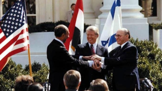 Ovako je pomoćnik državnog sekretara, Harold Sanders, opisao uloge glavnih aktera sporazuma u Kemp Dejvidu kojim je sklopljen mir između Egipta i Izraela i uspostavljeni diplomatski odnosi dve države. Pregovori u Kemp Dejvidu počeli su 13. septembra 1978. a okončani su 17. septembra 1978. potpisivanjem Okvirnog mirovnog sporazuma. Mirovni sporazum Egipta i Izraela potpisan je 26. marta 1979. u Vašingtonu. Potpisali su ga egipatski predsednik Anvar el Sadat i izraelski premijer Menahem Begin u prisustvu američkog predsednika Kartera. Ovim ugovorom Egipat je bio prva arapska država koja ja zvanično priznala Izrael.