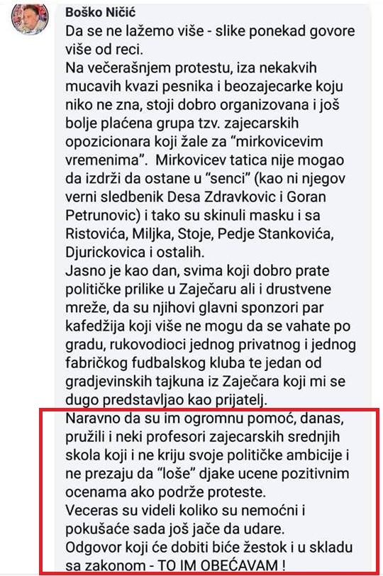 Gradonačelnik Boško Ničić putem društvene mreže „Facebook“ izneo je svoj osvrt na proteste održane prošlog petka, iznoseći niz tvrdnji u pogledu organizacije, političke pozadine protesta, ali i vezano za prosvetne radnike koji su uzeli učešće u protestu.