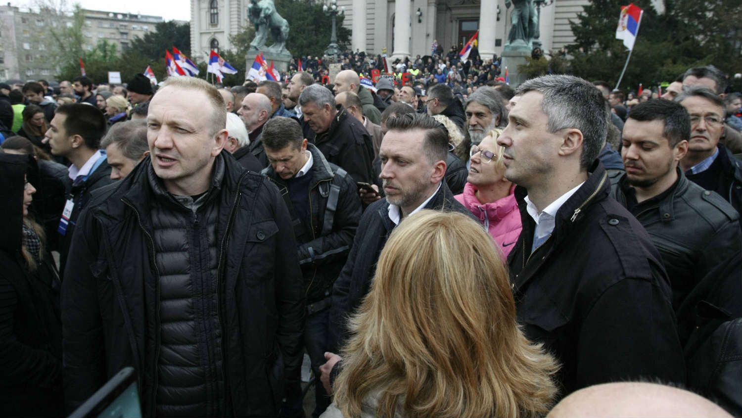 Iako se očekivalo da lideri Saveza budu zajedno, dok su trajali govori pred šetnju, to se nije dogodilo. Jeremić je sa suprugom i svojim stranačkim kolegama stajao odvojeno. Pored je bio Željko Veselinović, predsednik sindikata Sloga, sa svojim sindikalcima. Tu su negde bile i demokrate sa Lutovcem na čelu. A Đilas, Stefanović i Obradović držali su se zajedno.