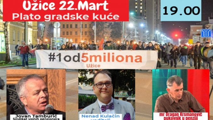 Protest „Jedan od pet miliona“ odražaće se u Užicu u petak, 22.marta, ispred zgrade Skupštne grada s početkom u 19 časova.