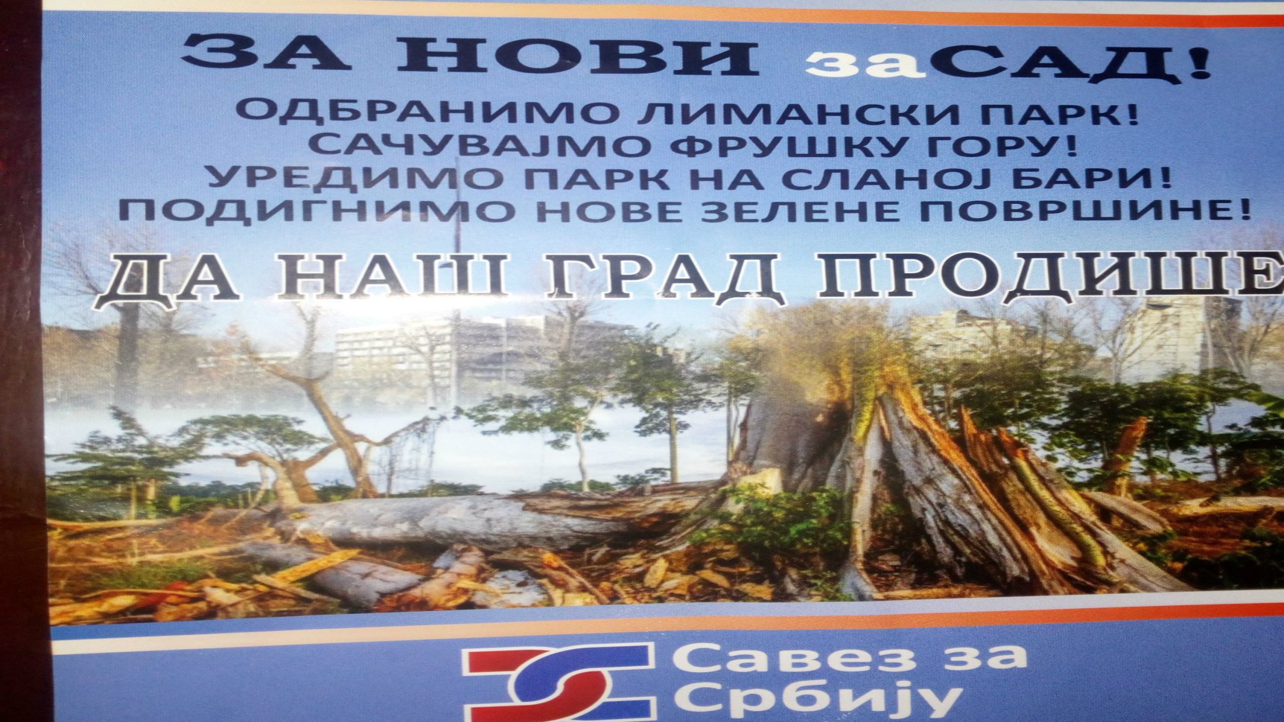 „Gradska vlast u Novom Sadu posekla je na stotine stabala i bezdušno uništavala zelenilo koje predstavlja opšte dobro kako bi privatnim investitorima omogućila da zarade na gradnji višespratnice, betoniranju i asfaltiranju. Sad je napadnut i Limanski park u kojem se planira izgradnja saobraćajnice za automobile i velika kafana. To bi dramatično smanjilo zelenu površinu, dok bi nov beton, asfalt i izduvni gasovi dodatno devastirali jedini park u tom delu grada. Otpor takvoj nazovi politici je obaveza svih demokratskih i građanskih snaga u Novom Sadu, a smena takve gradske vlasti nužan uslov da bi se zaustavilo ne samo uništavanje Limanskog parka, već i Fruške gore i, uopšte, budućnosti našeg grada“, navedeno je u proglasu SZS.