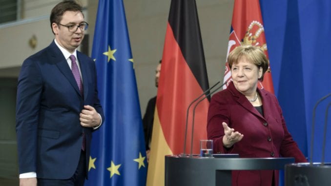 Kako se dalje dodaje, Vučić je kancelarki Merkel zahvalio na kontinuiranoj podršci Nemačke evrointegracijama Srbije, posebno imajući u vidu nemačko predsedavanje EU u drugoj polovini sledeće godine. U isto vreme izrazio je potrebu za postojanjem jasnog plana za proširenje EU i vremenskog okvira za članstvo, jer je proces evropskih integracija Zapadnog Balkana od značaja za mir i stabilnost u regionu. On je naglasio da će Srbija, sa istim ciljem – regionalne stabilnosti, nastaviti da promoviše politiku mira i saradnje.