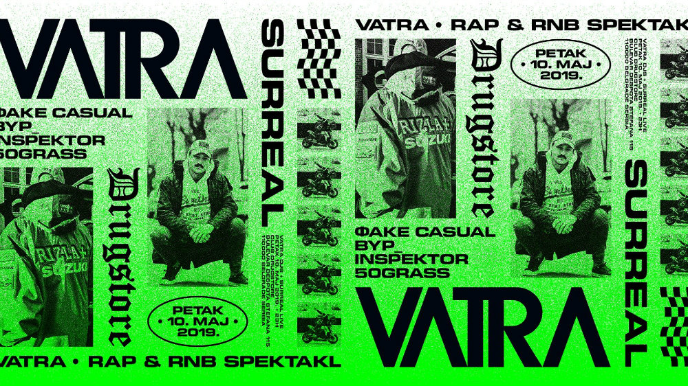 Rap & RnB Spektakl VATRA biće održan večeras sa početkom u 23 sata u klubu Drugstore Beograd. Nastupaju Surreal, Фake Casual, byp_, 50Grass, Inspektor, stoji u najavi događaja.