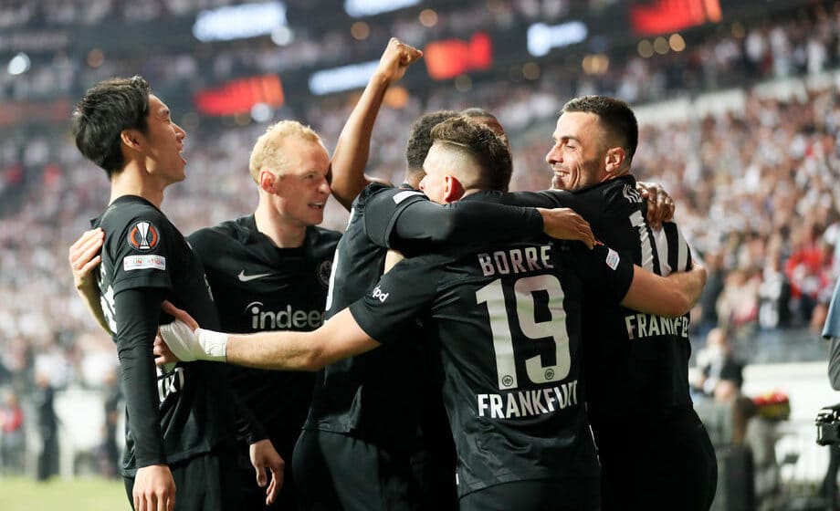 epa09929092 Rafael Santos Borre (2-R) of Frankfurt celebrates with teammates after scoring the 1-0 goal during the UEFA Europa League semi final, second leg soccer match between Eintracht Frankfurt and West Ham United in Frankfurt am Main, Germany, 05 May 2022. EPA-EFE/FRIEDEMANN VOGELFudbaleri Ajntrahta iz Frankfurta igraće protiv Glazgov Rendžersa u finalu Lige Evrope.