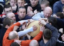 Stotine ljudi borilo se na ulici za posedovanje teške kožne lopte kao deo vekovne tradicije pokladnog utorka, preneo je BBC.