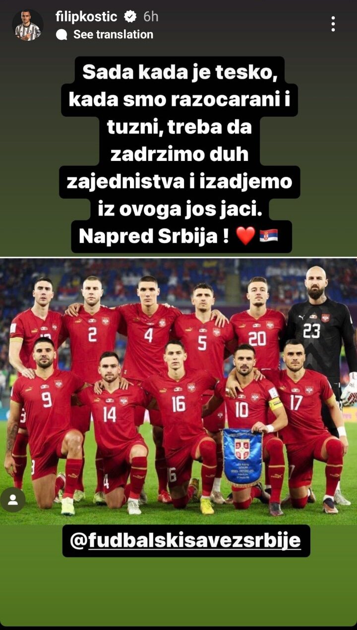 „Sada kada je teško, kada smo razočarani i tužni, treba da zadržimo duh zajedništva i izažemo iz ovog još jači. Napred, Srbija!“, poručio je igrač Juventusa.