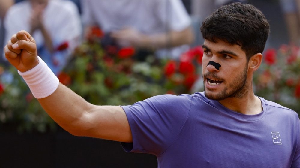 Karlos Alkaraz. Foto: EPA-EFE/FABIO FRUSTACIŠpanski teniser Karlos Alkaraz plasirao se u polufinale Masters turnira u Rimu jer je u četvrtfinalnom duelu pobedio Džeka Drejpera sa 6:4, 6:4.