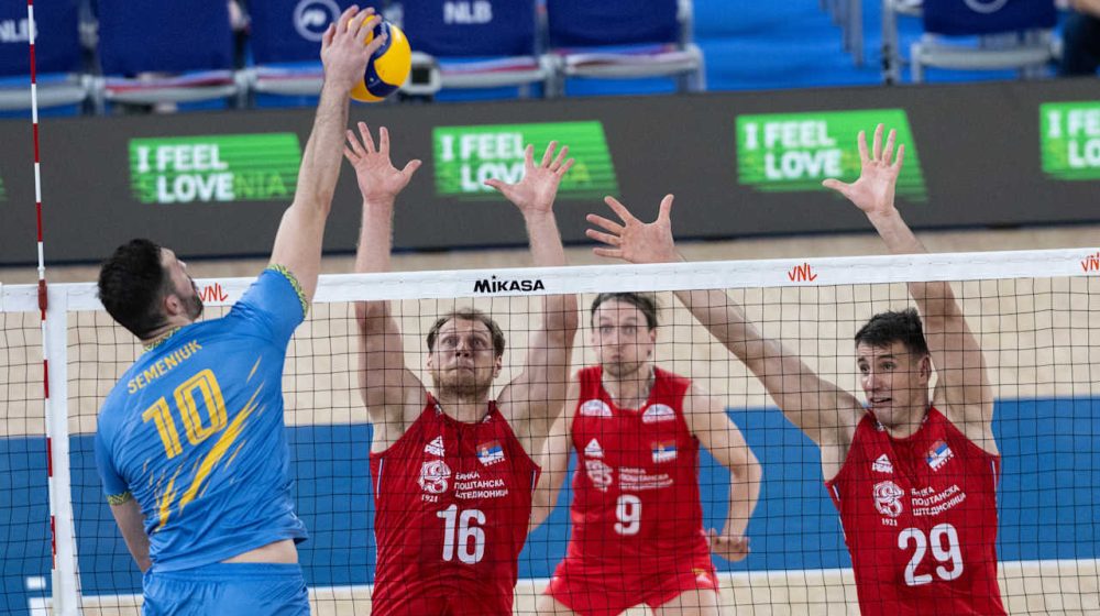 Odbojkaši Srbije na meču sa Ukrajinom. Foto: FIVBOdbojkaška reprezentcija Srbije upisala je drugu pobedu u novoj sezoni Lige nacija, jer je u meču destog kola savladala Ukrajinu sa 3:0 (25:22, 25:19, 25:17).