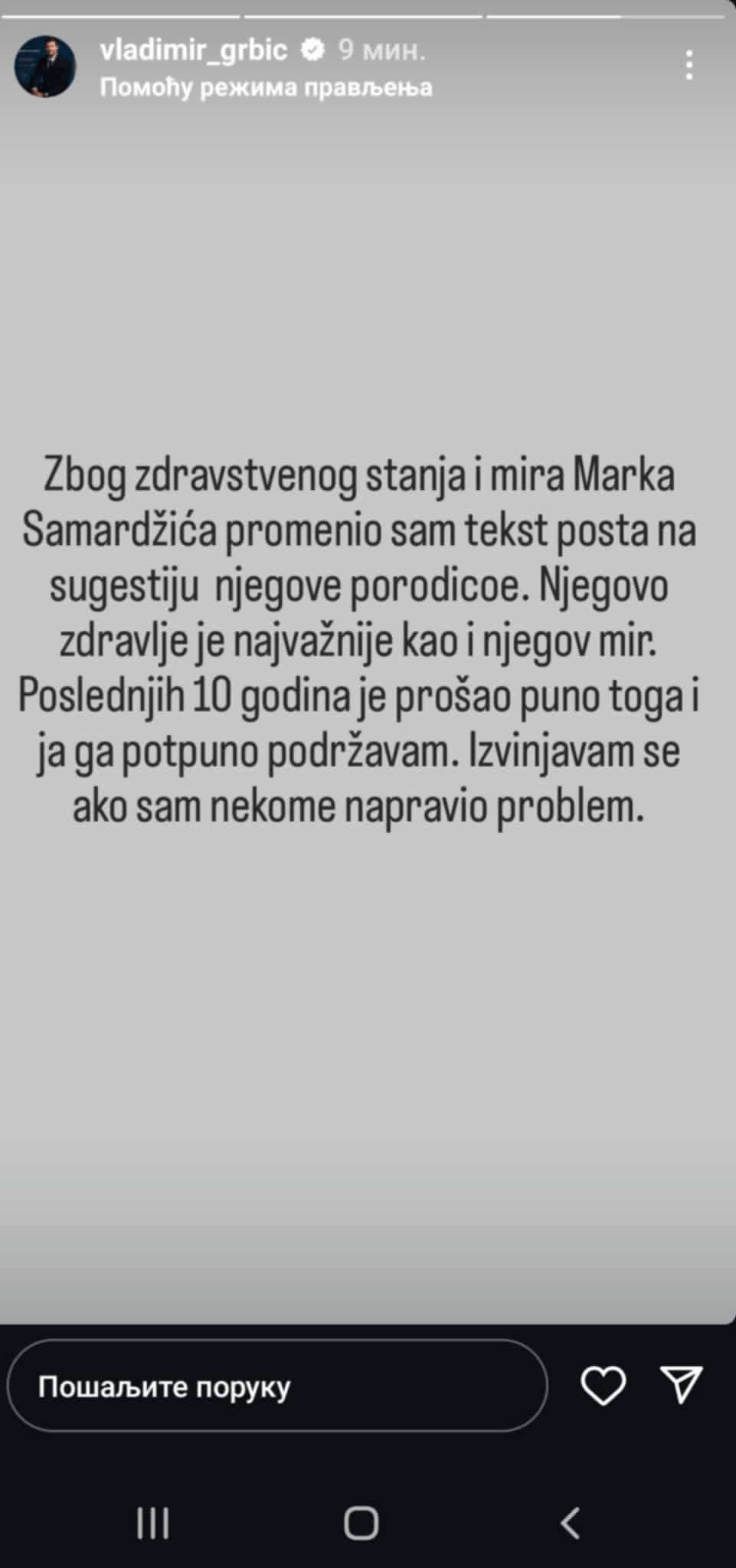 – Zbog zdravstvenog stanja i mira Marka Samardžića promenio sam tekst posta na sugestiju njegove porodice. Njegovo zdravlje je najvažnije kao i njegov mir. Poslednjih 10 godina je prošao puno toga i ja ga potpuno podržavam. Izvinjavam se ako sam nekome napravio problem.