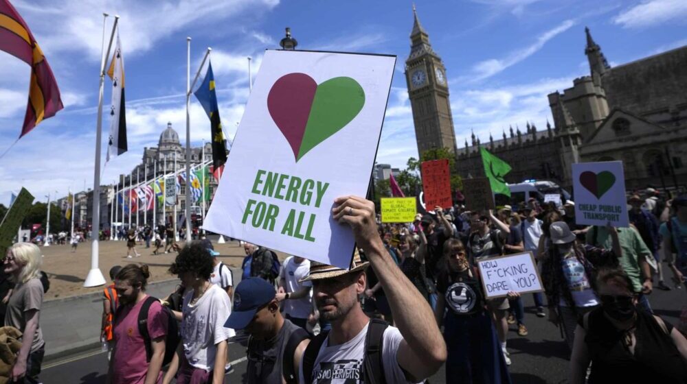 Grupe aktivista predvodile su demonstrante okupljene na Trgu parlamenta u Londonu zahtevajući da konzervativna vlada prestane da daje nove dozvole za proizvodnju nafte i gasa, i počne da oporezuje velike zagađivače.