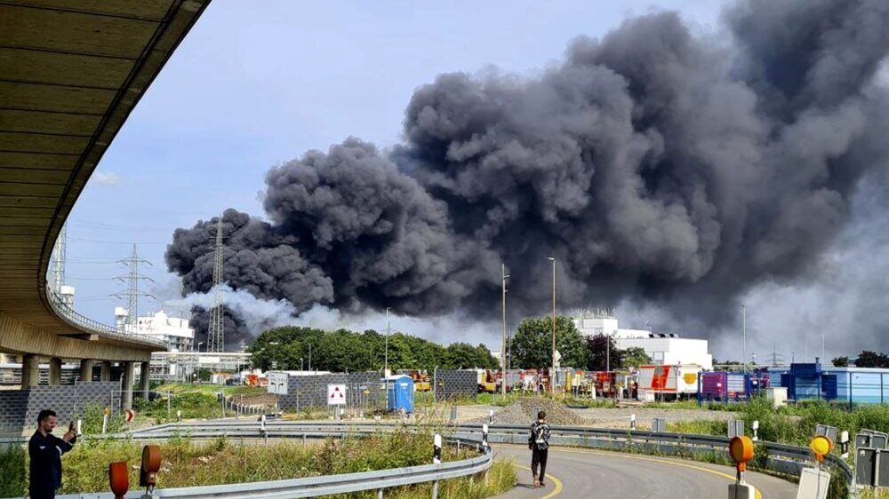 Foto: Mirko Wolf/dpa via APSnažna eksplozija u hemijskom kompleksu potresla je danas nemački grad Leverkuzen, nakon čega se nad gradom nadvio veliki crni oblak dima.