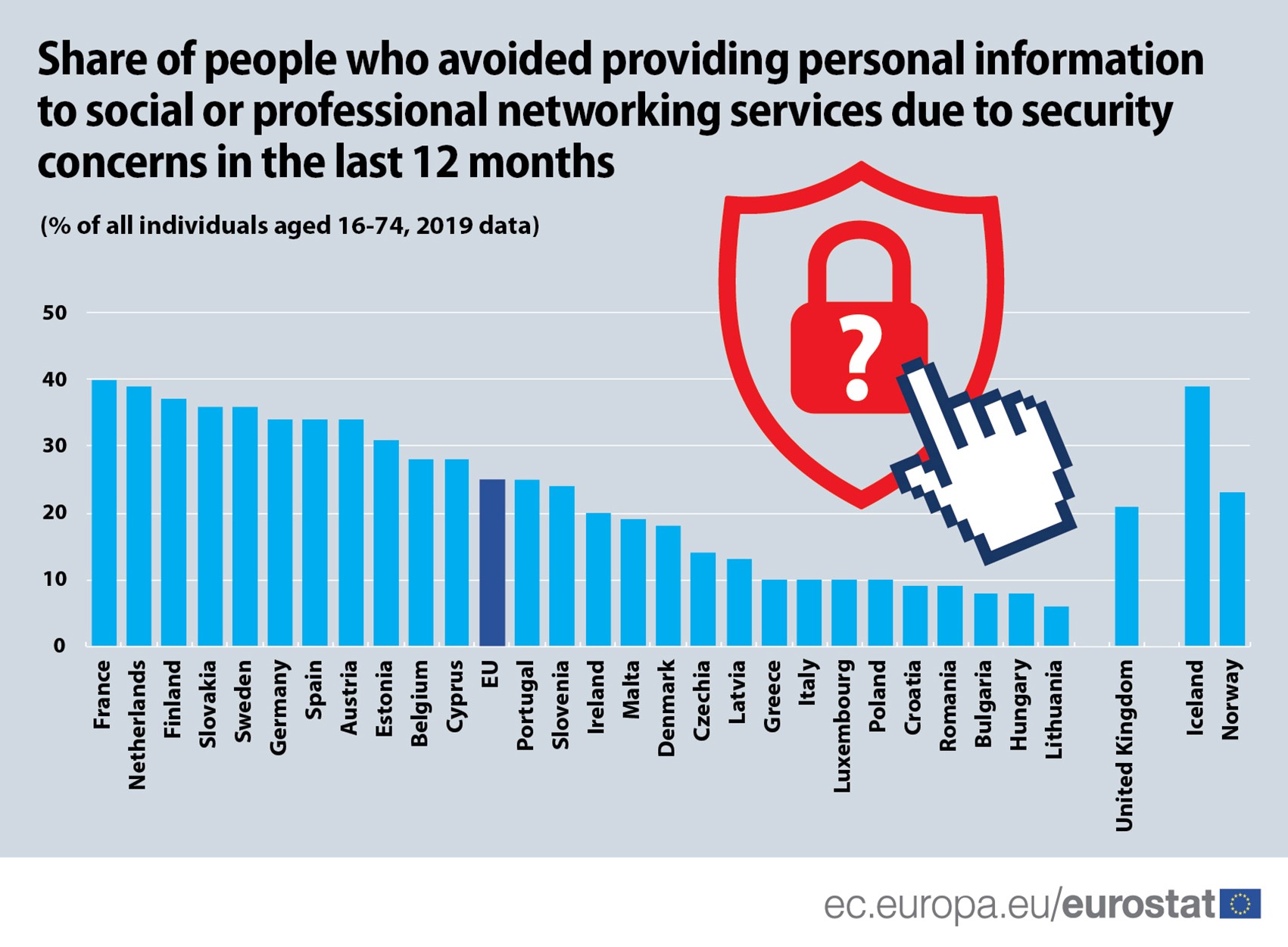 Prema podacima Eurostata, jedan od četiri državljana EU starosti između 16 i 74 godine tvrdio je da je izbegavao da pruži lične podatake društvenim ili profesionalnim mrežama u 2019. godini iz bezbednosnih razloga.