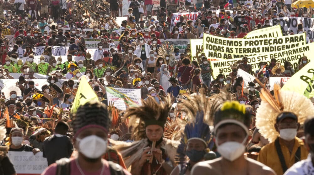 Foto: Beta/AP/Eraldo PeresHiljade brazilskih domorodaca učestvovale su danas u protestnoj šetnji do Vrhovnog suda radi vršenja pritiska na sudije uoči presude sa dalekosežnim uticajem na prava u vezi sa posedovanjem zemlje.