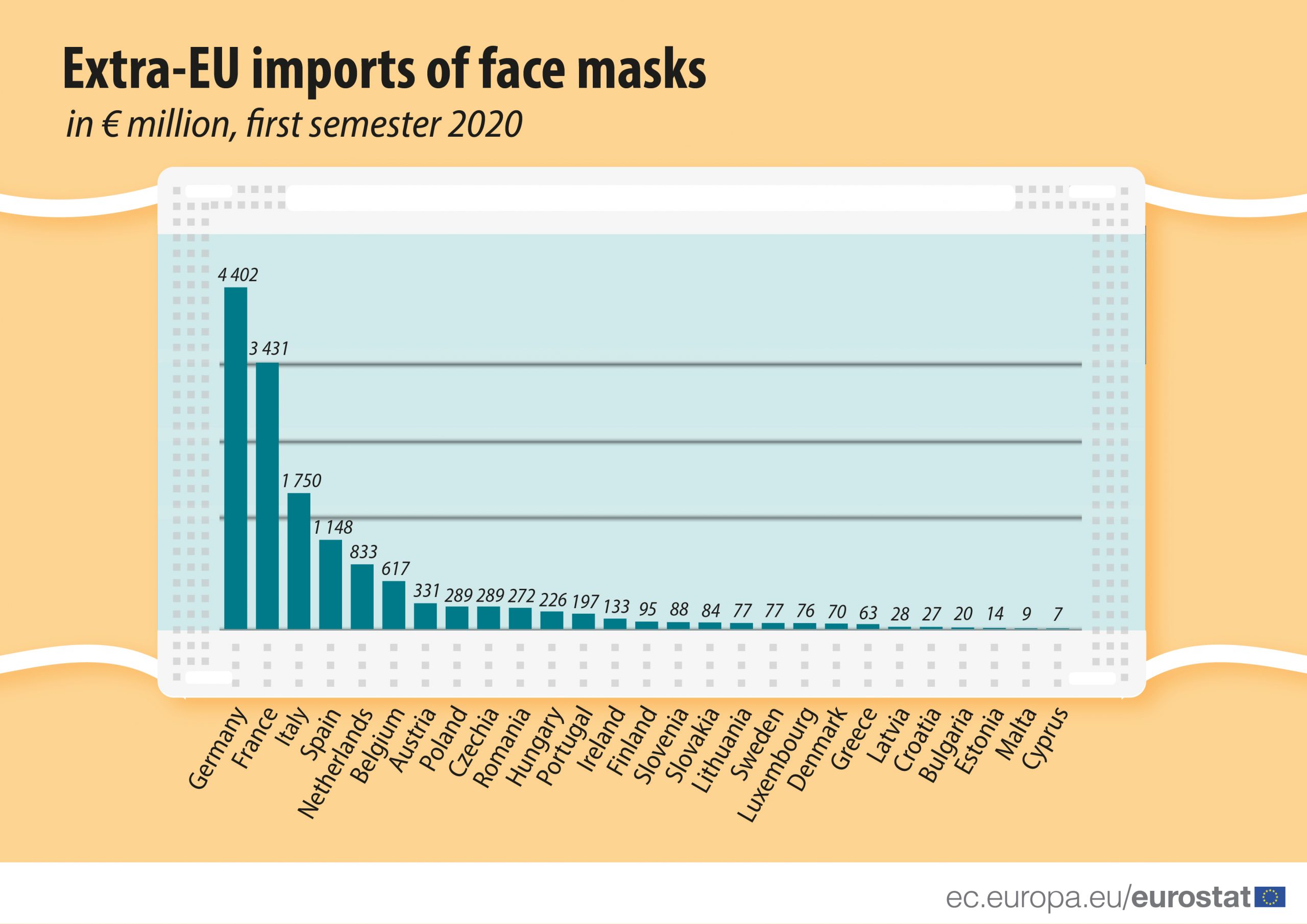 Poredeći prvu polovinu 2019. sa prvom polovinom 2020. godine, vrednost uvoza maski za lice u Evropsku uniju drastično je porasla, sa 800 miliona na 14 milijardi evra, što čini porast od 1.800 odsto.