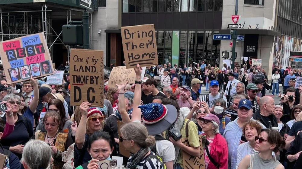 „Nema kralja u Americi“, ili „Pružimo otpor tiraniji“, može se videti na plakatima na demonstracijama u Njujorku, pored slika američkog predsednika sa Hitlerovskim brkovima.