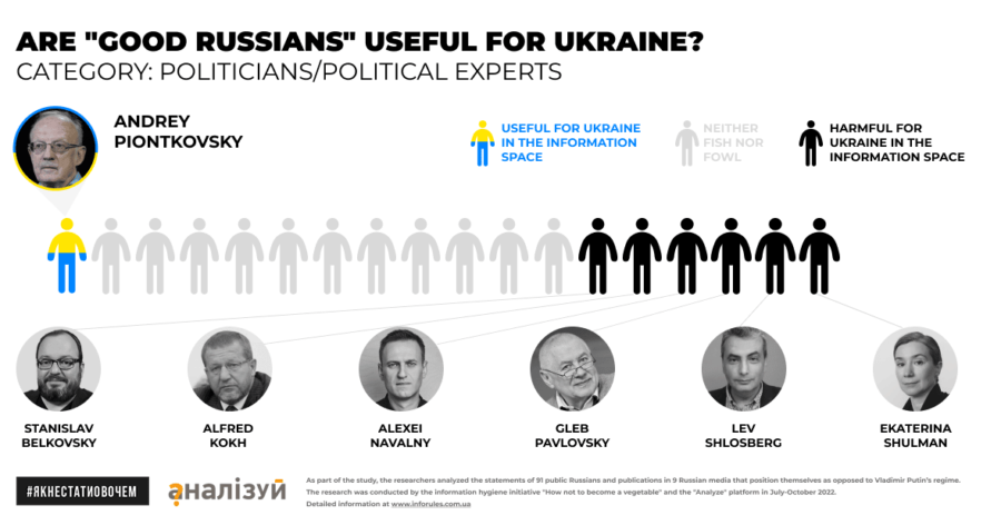 Među 91 analiziranim Rusom koji kritikuju Putina, samo šestoro dosledno podržava Ukrajinu u informacionom prostoru. Andrej Piontkovski, na primer, jedini među njima ima jasnu javnu tačku gledišta o svim ključnim pitanjima: rusko-ukrajinskom ratu (od 2014), aneksiji Krima, priznanju Rusije kao agresora; on priznaje da su Rusi krivi za rat. Ograničenja izdavanja viza Rusima on smatra blagim oblikom kazne za kolektivnu odgovornost.