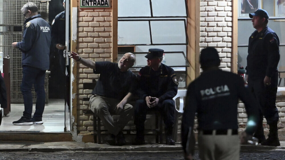 National Crusade Party presidential candidate Paraguayo Cubas, center left, sits next to police Sub Commissioner Baldomero Jorgge, outside the Specialized Group building where Cubas is being held, in Asuncion, Paraguay, Friday, May 5, 2023. Paraguayan police on Friday, detained Cubas, a far-right populist who came in third in Sunday’s presidential election and encouraged his supporters to protest over his unsubstantiated claims that the vote was marred by fraud.(AP Photo/Fernando Romero)Paragvajska policija uhapsila je krajnje desničarkskog političara Paragvaja Kubasa koji je pristalice pozvao da protestom isprave krađu na predsedničkim izborima na kojima je on u nedelju bio treći.
