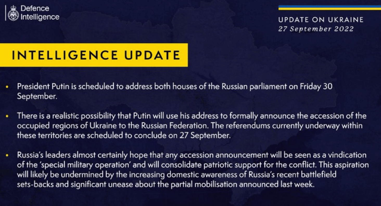 U njemu se navodi da bi se ruski predsednik Vladimir Putin u petak, 30. septembra, trebao obratiti ruskom parlamentu te kako „postoji realna verovatnoća da će Putin iskoristiti obraćanje kako bi formalno najavio aneksiju okupiranih regija Ukrajine“.