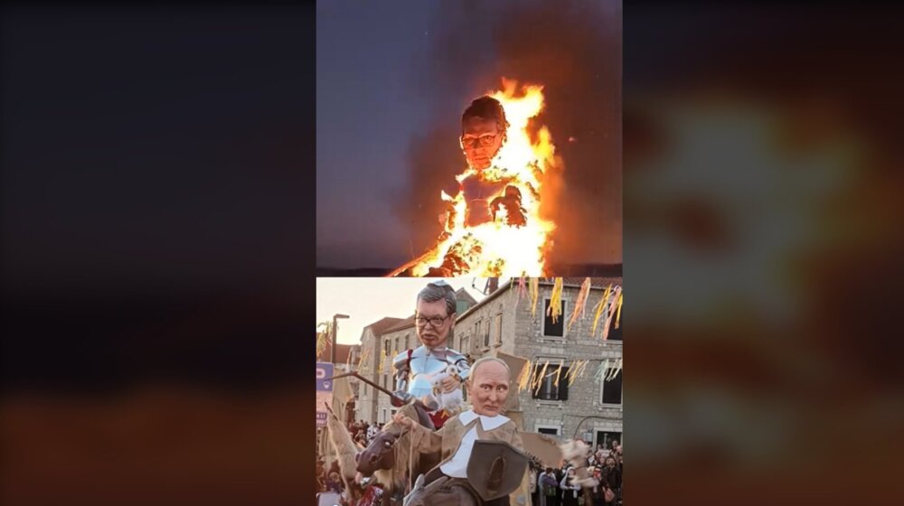 foto: printscreen/tiktok/dalmatinskiportalNa manifestaciji koja je održana juče u Kaštelima u Splitsko-dalmatinskoj županiji u Hrvatskoj, učesnici maskenbala su posle defilea spalili lutke sa likovima predsednika Srbije i Rusije Aleksandra Vučića i Vladimira Putina.