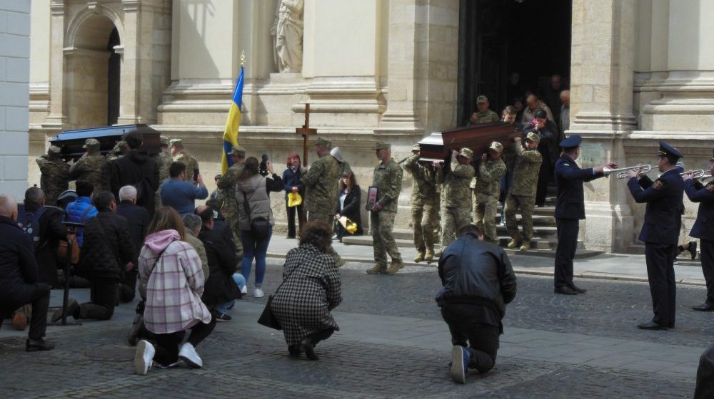 Normalnost u Lavovu je samo prividna. U grčko-katoličkoj crkvi Svetog Andreja svakodnevno se održavaju sahrane vojnika iz Galicije – regije čiji je Lavov glavni grad – koji su poginuli na frontu. Svakog jutra, a često i popodne, isti srceparajući protokol: služba u crkvi, s rodbinom, saborcima i građanima. Blede devojke s otečenim, crvenim očima nose belo cveće do kovčega. Na kraju, kovčezi odlaze, vojni orkestar prati povorku do mrtvačkih kola, građani kleče i spuštaju glave pri pronošenju pokojnika. Povorka automobila kreće, prelazi stotinjak metara i zaustavlja se ispred Opštine, tipične građevine iz austrougarskog doba, u neorenesansnom stilu i sa tornjem u sredini. Iz Opštine izlazi trubač i svira pogrebnu melodiju. Automobili i autobusi se zaustavljaju, gase motore, vozači i putnici izlaze i kleknu, iako je put još uvek mokar.