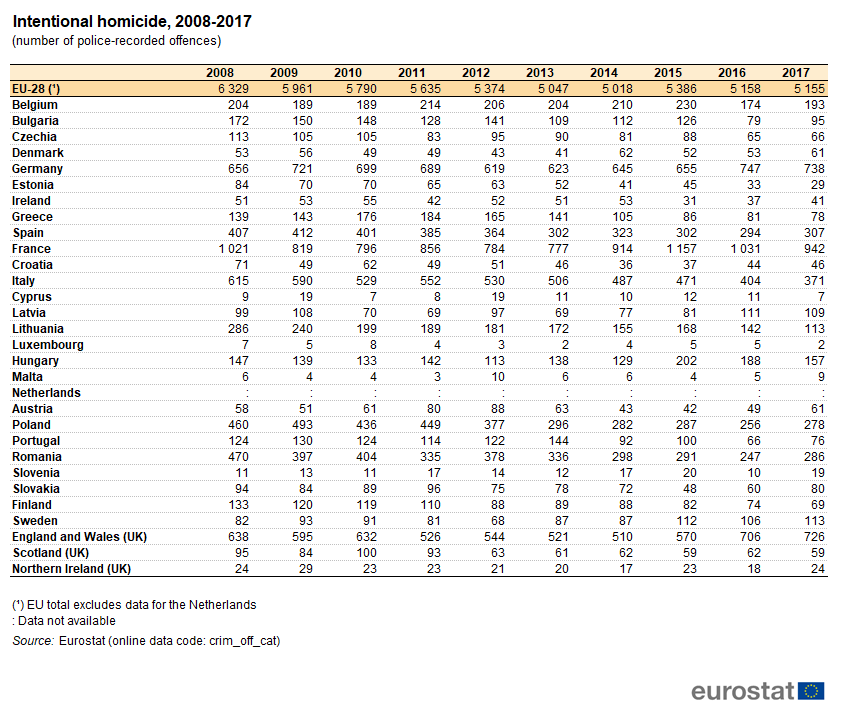 Među državama članicama, najveći broj evidentiranih namernih ubistava na 100.000 stanovnika, kako navodi Eurostat, zabeležen je u Letoniji (5,6), Litvaniji (4,0), Estoniji (2,2) i Malti (2,0), dok je najmanji primećen u Luksemburgu (0,3) ), Češkoj i Italiji (oba 0,6).
