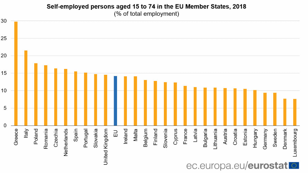 Od svih zemalja članica EU najviše samozaposlenih ima Grčka – skoro svaka treća zaposlena osoba bila je samozaposlena u 2018. godini (30 odsto), a slede je Italija (22 odsto), Poljska (18 odsto) i Rumunija (17 odsto) – u kojima je to slučaj otprilike sa svakom petom osobom.