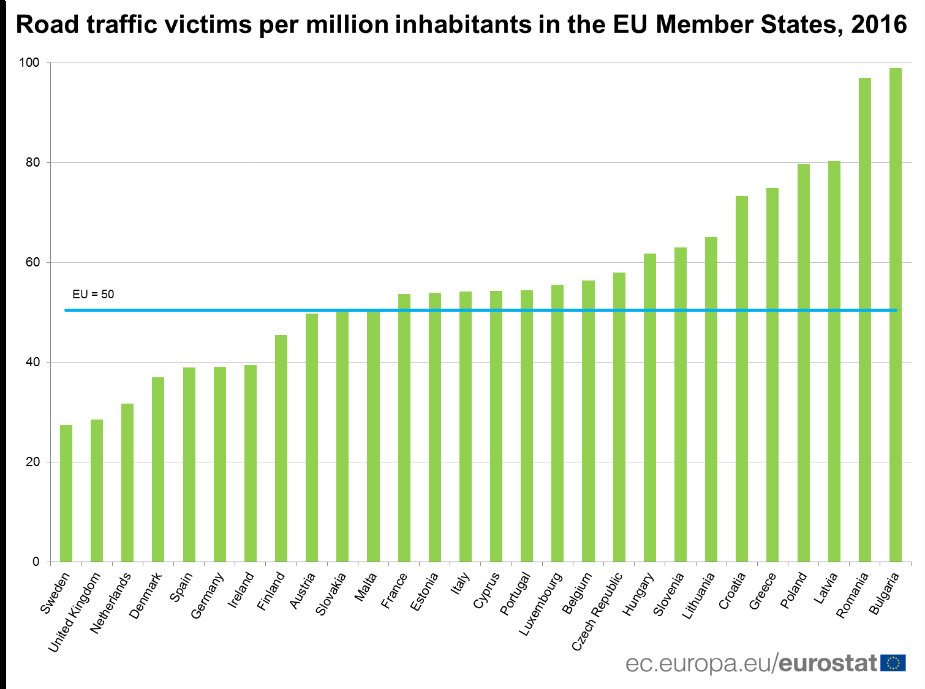 S druge strane, najveći broj žrtava broji se u Bugarskoj – 99 na milion stanovnika, Rumuniji 97, Letoni i Poljskoj sa po 80, Grčkoj 75 i Hrvatskoj 73. Ukupno gledajući, bilo je oko 50 žrtava u saobraćaju na milion stanovnika prošle godine na nivou cele EU.