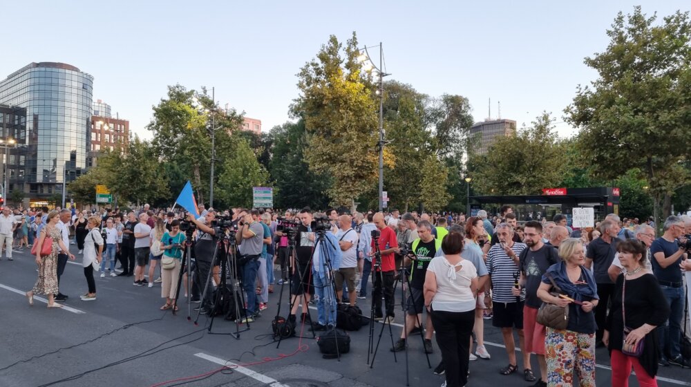 Građani u protestnoj koloni uzvikuju „Vučiću odlazi“, a čuju se i pištaljke i vuvuzele.