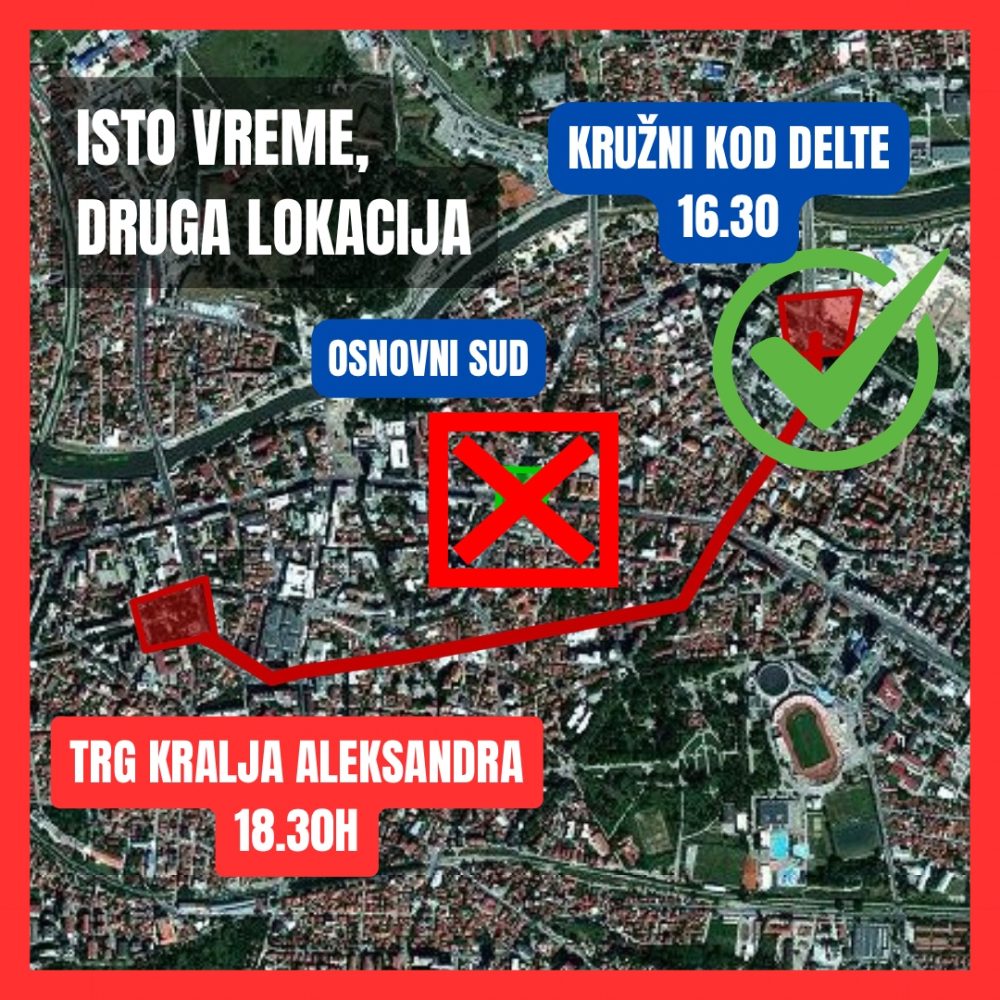 „Tačka okupljanja kod Osnovnog suda se, zbog bezbednosnih rizika koje nam je saopštila policija, pomera na kružni tok kod Delte“, navela je NGS.