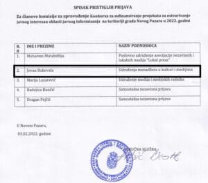 Od pet kandidata, novopazarski gradonačelnik Nihat Biševac imenovao je troje za članove komisije: Muharema Mutabdžiju, dugogodišnjeg novinara iz Prijepolja, Mariju Lazarević, studentkinju Agroekonomskog fakulteta u Čačku i urednicu portala TopPress i Top medij iz Topole i Radojicu Bunčića, nezavisnog medijskog stručnjaka.