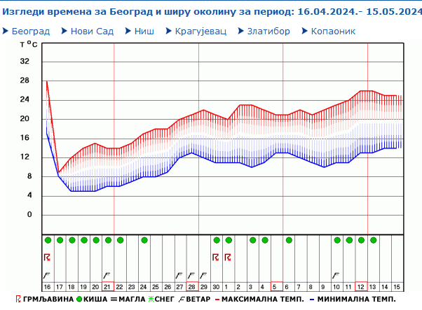 Padavina u Beogradu trebalo bi da bude i 30. aprila, kao i 1. maja, ali i u periodu od 11. do 14. maja. Najviše dnevne temperature će, posle 26. aprila, biti više od 20 stepeni Celzijusa.