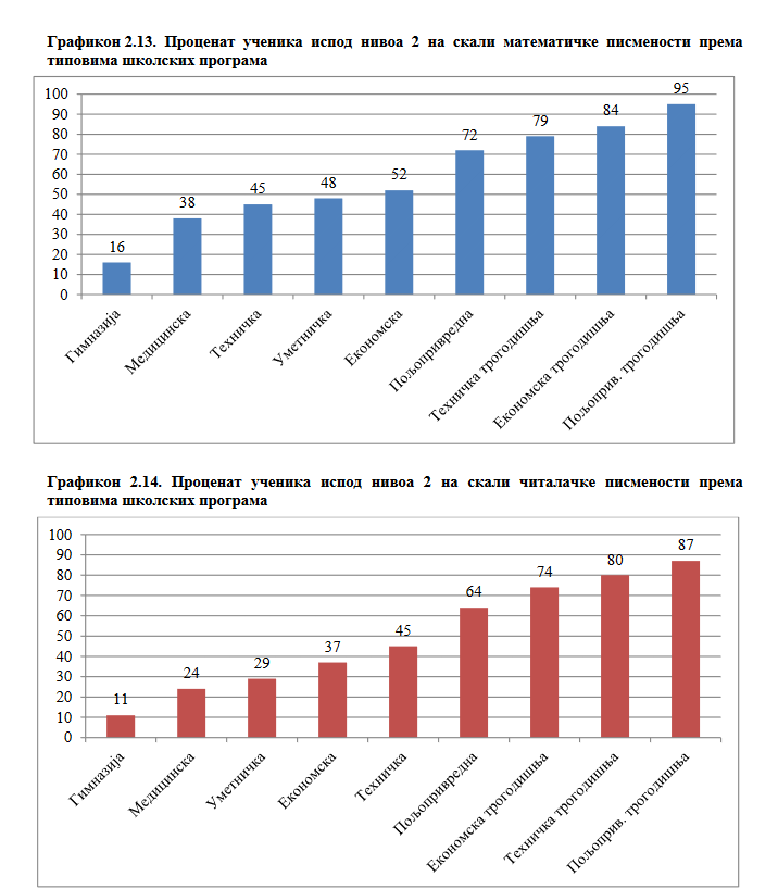 Kako se dodaje, najmanje učenika koji ne dostižu nivo funkcionalne pismenosti je među gimnazijalcima – takvih je oko 16 odsto iz matematike i 11 odsto iz čitanja, slede četvorogodišnje stručne škole (od 38 do 72 odsto iz matematike i od 24 do 64 odsto iz čitanja) i, konačno, tu su trogodišnje stručne škole u kojima u proseku između 79 i čak 95 odsto dece ne dostiže ni osnovni nivo pismenosti u oba pomenuta domena.