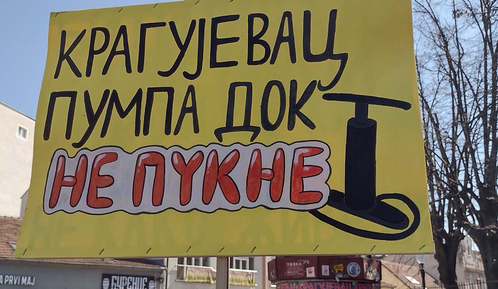 13.55 Uz zvuke Marša na Drinu i povike „Svi na ulice“, „Generalni štrajk“ i „Pumpaj“ kolona u Kragujevcu je stigla ispred Skupštine grada. Oko zgrade je formiran krug sa transparentima i šetalicama na stepeništu glavnog ulaza.