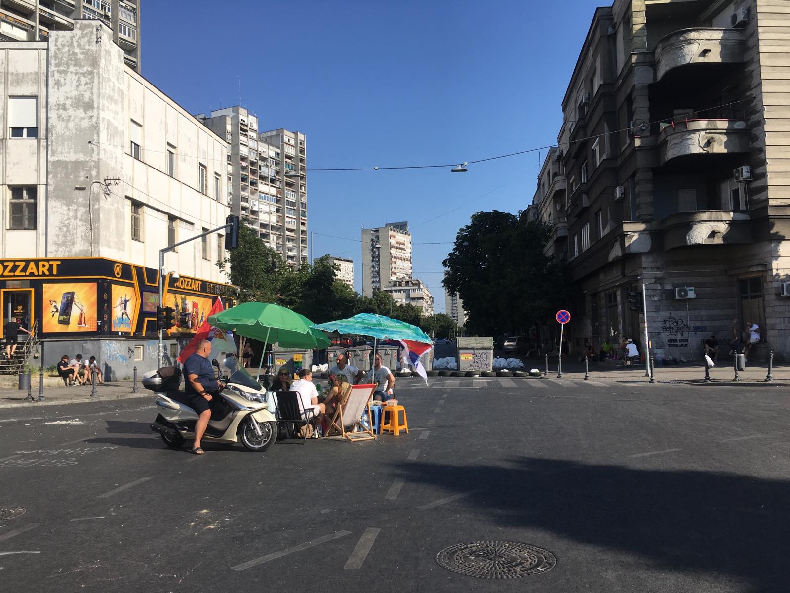 Saobraćaj je omogućen iz Ruzletove ulice u smeru ka Zvezdari. Tramvajski saobraćaj je obustavljen, a nekolio tramvaja stoji. Atmosfera je trenutno mirna, a za sada su tu samo patrole saobraćajne policije. Okupljeni duvaju u pištaljke i vuvuzele i igraju karte, javlja Fonet.