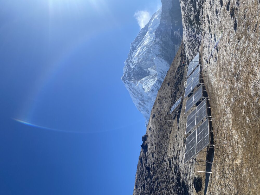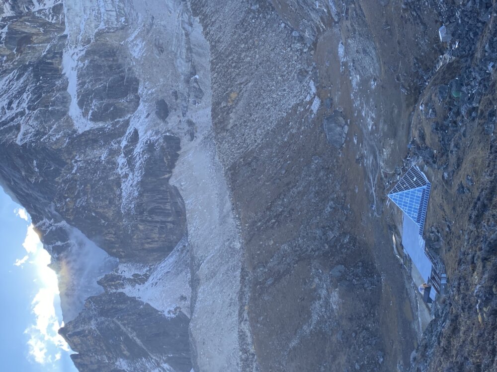 Na svega dva dana hoda do kampa, potražili smo smeštaj za noćenje iza mesta Lobuče, gde se iza stena potpuno neočekivano pojavio vrh interesantnog oblika. Malo ljudi očekuje da će pronaći piramidu visoko u Himalajima, na korak od glečera Khumbu gde srednje dnevne maksimalne temperature ostaju ispod nule pola godine. Prekrivena solarnim panelima i smeštena na vrhu niske kamene zgrade, piramida Everesta je čudan prizor među stenama i snežnim planinama.