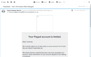 Drugi primer fišing mejla je recimo poruka koju je navodno poslao Pejpal, a u kojoj se korisnik obaveštava da mu je račun blokiran i da klikom na određeni link i unosom svojih podataka povezanih sa Pejpal računom može da ga odblokira.