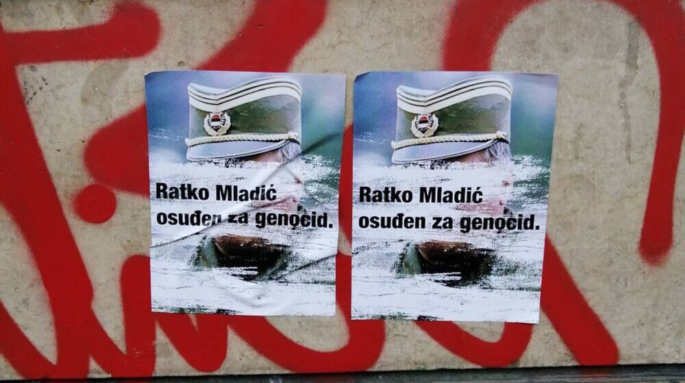 Foto: DanasNalepnice sa natpisom Ratko Mladić osuđen za genocid pojavile su se danas na više mesta u centru Beograda, a u anonimnom saopštenju koje je dobio list Danas piše: “Građani neće stati spomen-mural mora pasti”.