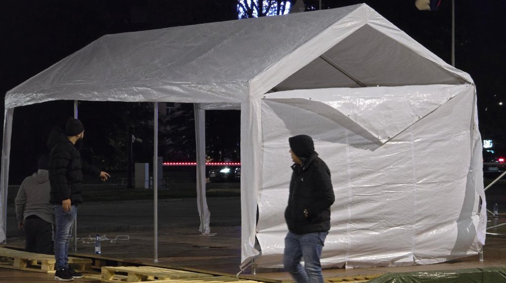 Foto: Marko Dragoslavić / FoNetViše od belih 10 šatora postavljeno je večeras na platou ispred Skupštine Srbije, dok se u Pionirskom parku okupljaju grupe od po desetak i više ljudi, mnogi od njih sa kapuljačama na glavama, javljaju reporteri FoNeta.