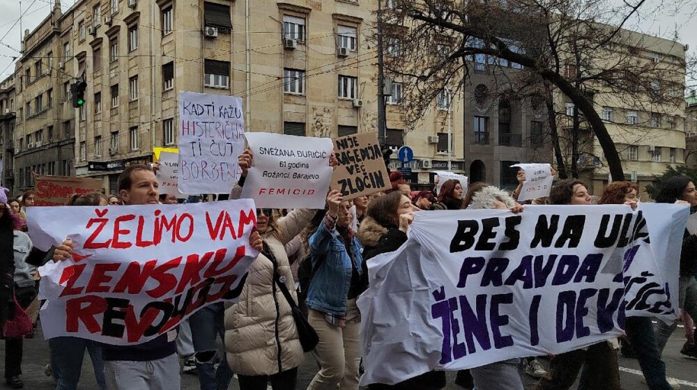 Nosile su i transarente sa porukama „Skoro svaki femicid je mogao biti sprečen“, „Besne žene“, „Koja je sigurna?““, Ne dozvoli da te iko stišava“, „Sram mora promeniti stranu“.