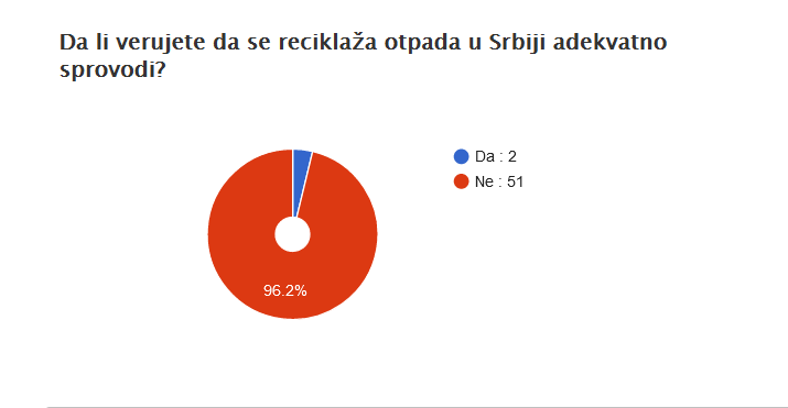 Inače, Ministarstvu zaštite životne sredine Danas je u više navrata uputio mejl sa pitanjima o procesu reciklaže u Srbiji i problemima, međutim, do zaključivanja ovog broja nismo dobili odgovore. Oni koji su bili voljni da odgovaraju su našu građani. Gotovo svi, sem dva upitanika, koji su odgovarali na Danasovu anketu, na pitanje – da li verujete da se reciklaža otpada u Srbiji adekvatno sprovodi, odgovorili su sa „ne“.