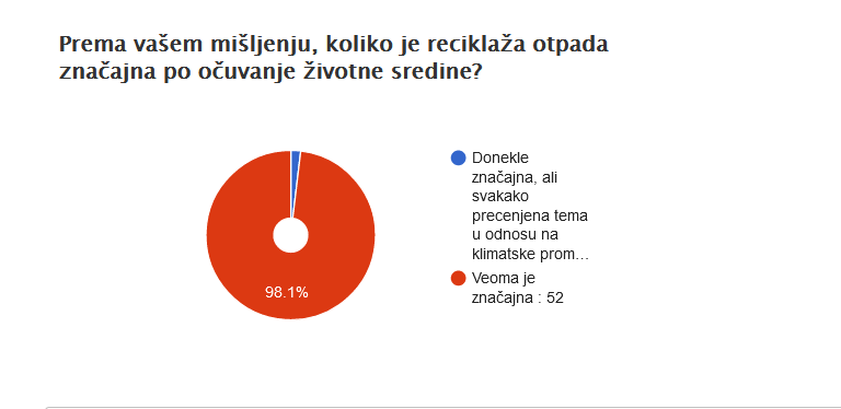 Ono što je isto za gotovo sve naše anketirane građane, jeste odgovor na pitanje – koliko je reciklaža otpada značajna po očuvanje životne sredine. Svi sem jedne osobe štiklirali su polje „veoma je značajna“, dok je jedna osoba pismeno odgovorila sa „donekle značajna, ali svakako precenjena tema u odnosu na klimatske promene“.