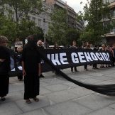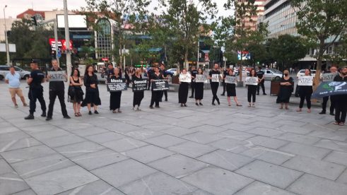 Na performansu Žene u crnom su raširile crnu tkaninu, na čijem je kraju položen venac od belog cveća i kamen sa natpisom 8.372.