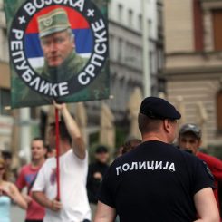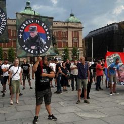 Na kontra skupu okupljeni desničari nose zastave sa slikama Ratka Mladića, zastavu sa napisom Vojska Republike Srpske i transparent „Nije bilo genocida“. Pevaju patriotske pesme, između ostalih i „Oj Kosovo, Kosovo“, „Mladiću moj, problem je tvoj što si srpski heroj“ i „Spremte se spremte četnici“.