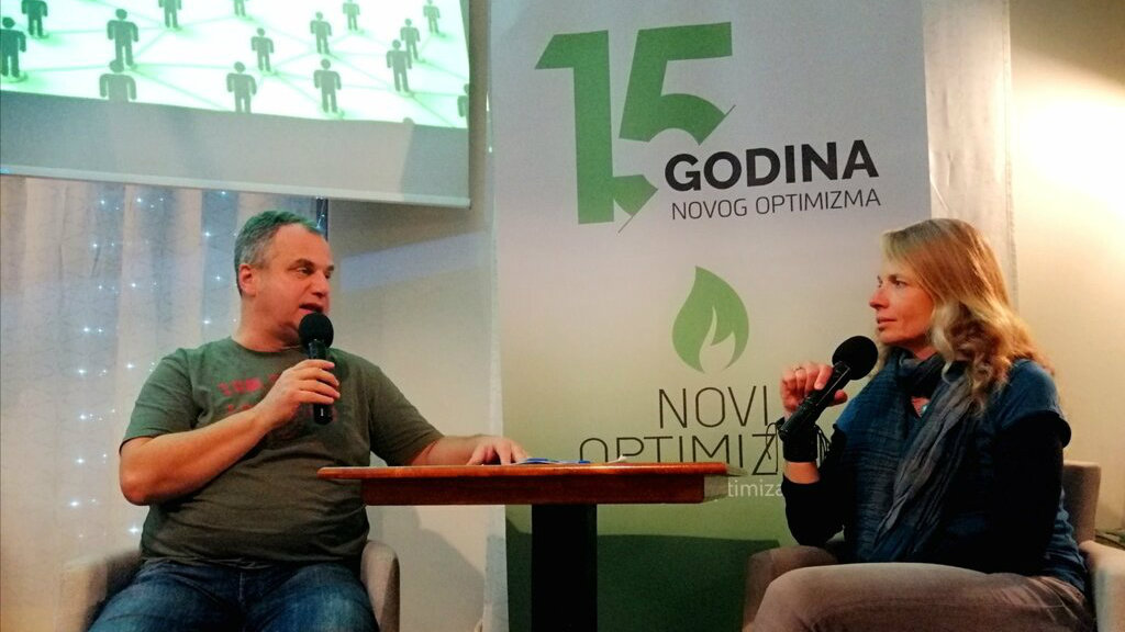 Sinoć je u prepunom Radio kafeu, prvo premijerno prikazan kratak film o 15 godina Novog Optimizma – „15 drugačijih“, a ta retrospektiva decenije i po istrajnosti i insistiranja na slobodi pojedinca i značaju građanskog aktivizma nikoga u publici nisu ostavili ravnodušnim. Uz izjave javnih ličnosti o optimizmu Mirka Đorđevića, Borke Pavičević, Branke Prpe, Nebojše Popova i drugih, kao i kratak siže akcija, inicijativa i projekata Novog optimizma tokom 15 godina „prevrteo je film“ i u glavama svih u publici te je Branislav Guta Grubački, osnivač Pokreta dobio veliki aplauz od prisutnih.