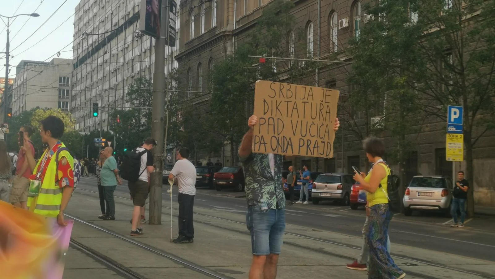 17.40 Istaknut je i transparent protiv predsednika Srbije Aleksandra Vučića, a na neki način i Prajda. Kolona je na kratko stala pored zgrade Vlade