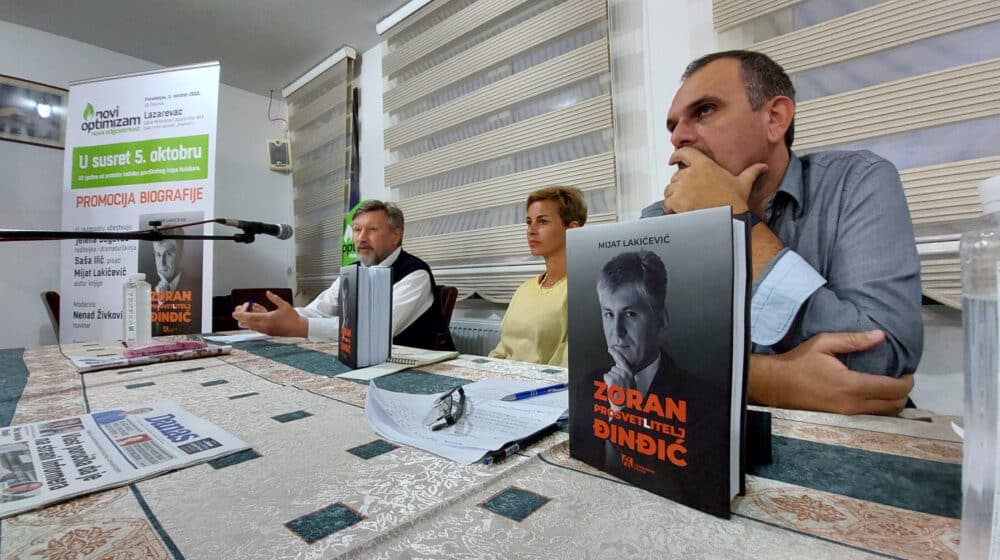 Foto: Novi optimizamKnjiga Mijata Lakićevića „Zoran Đinđić, Prosvet(l)itelj“ opisuje ideje i događaje koji su i dan danas izuzetno aktuelni. Mijat je uspeo, ne samo da napiše ozbiljnu političku i intelektualnu biografiju Zorana Đinđića, već i da nam ponovo u javni diskurs ubaci sve one teme koje nas okupiraju poslednjih 30, 40 pa i 50 godina, rečeno je večeras na promociji Đinđićeve biografije.